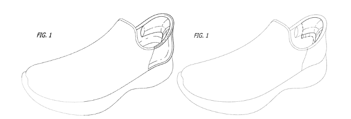 從Skechers專利來看,五件專利的代表圖式(如下)顯示此設計在視覺上將鞋跟區域與鞋的其他部分做出區分,賦予其極具吸引力的獨特視覺外觀。